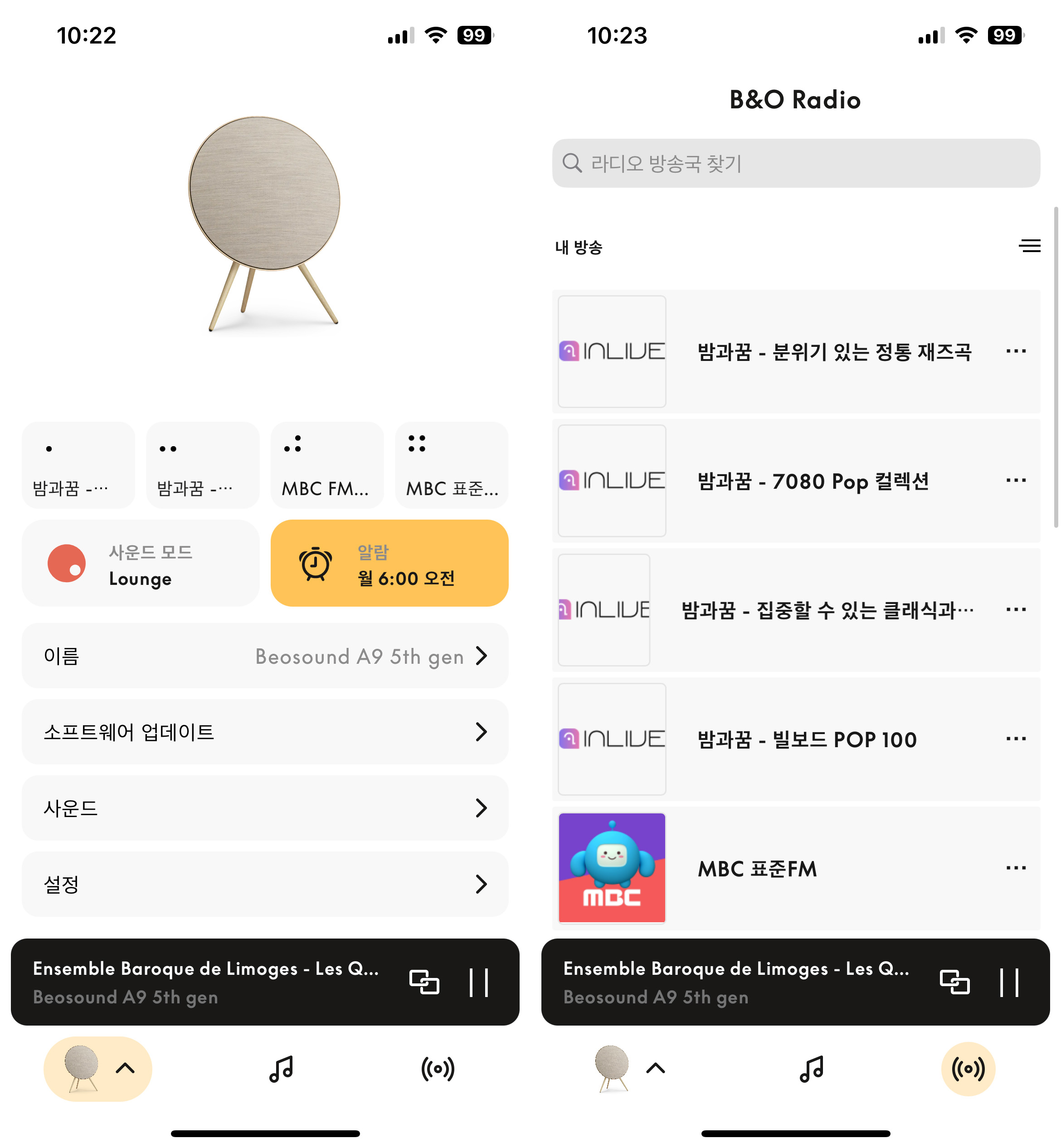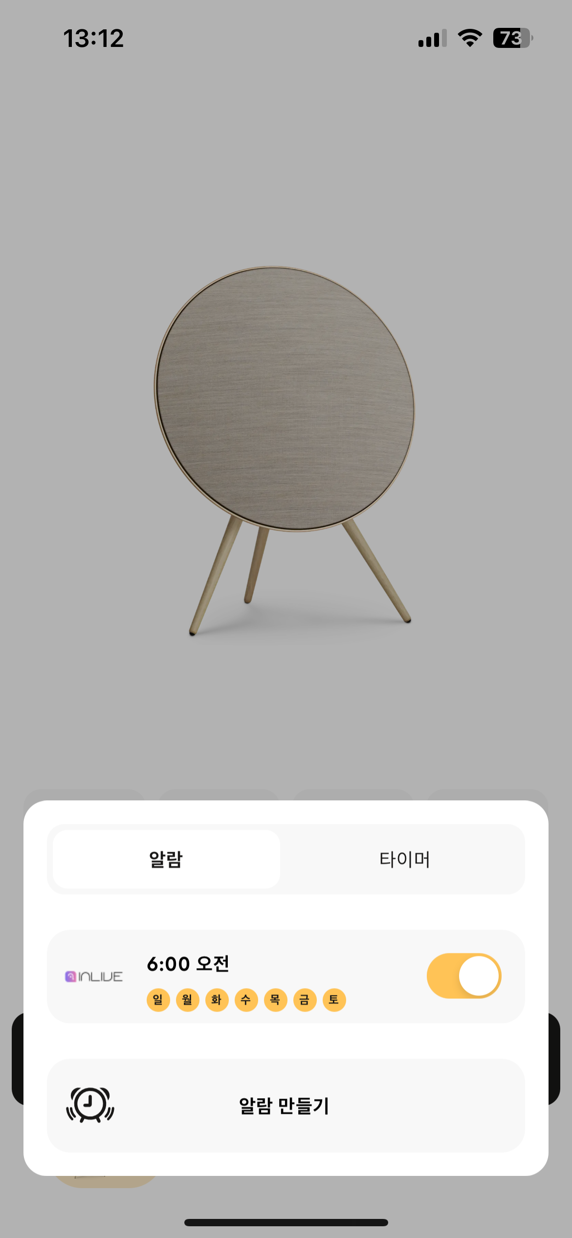 B&O App 에서 알람 설정을 해두고, 알람시 재생할 소스 음원을 B&O 에서 제공하는 기본 라디오 채널을 선택해 두면, 정해진 시간에 B&O 스피커에서 알람 음악이 재생된다.