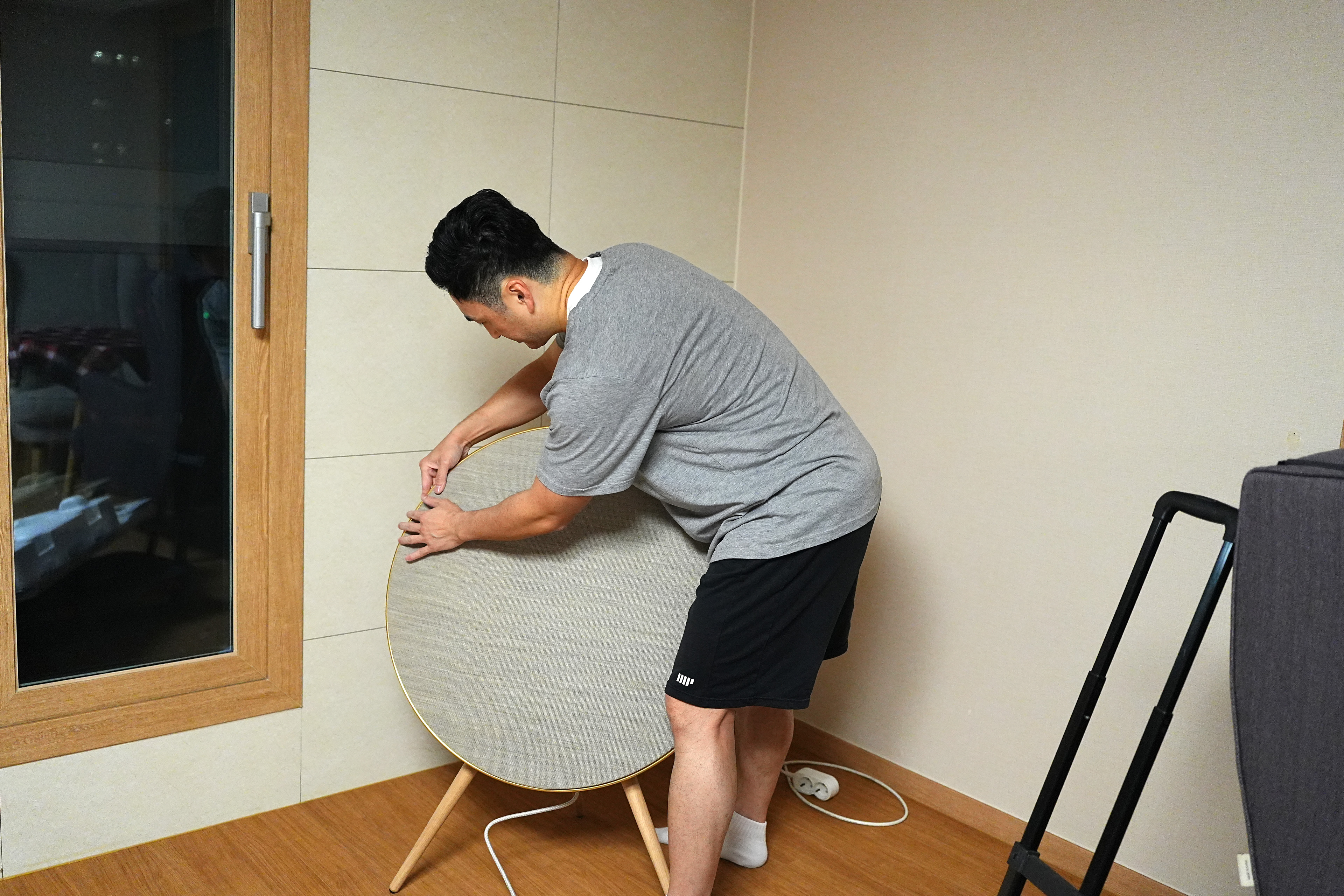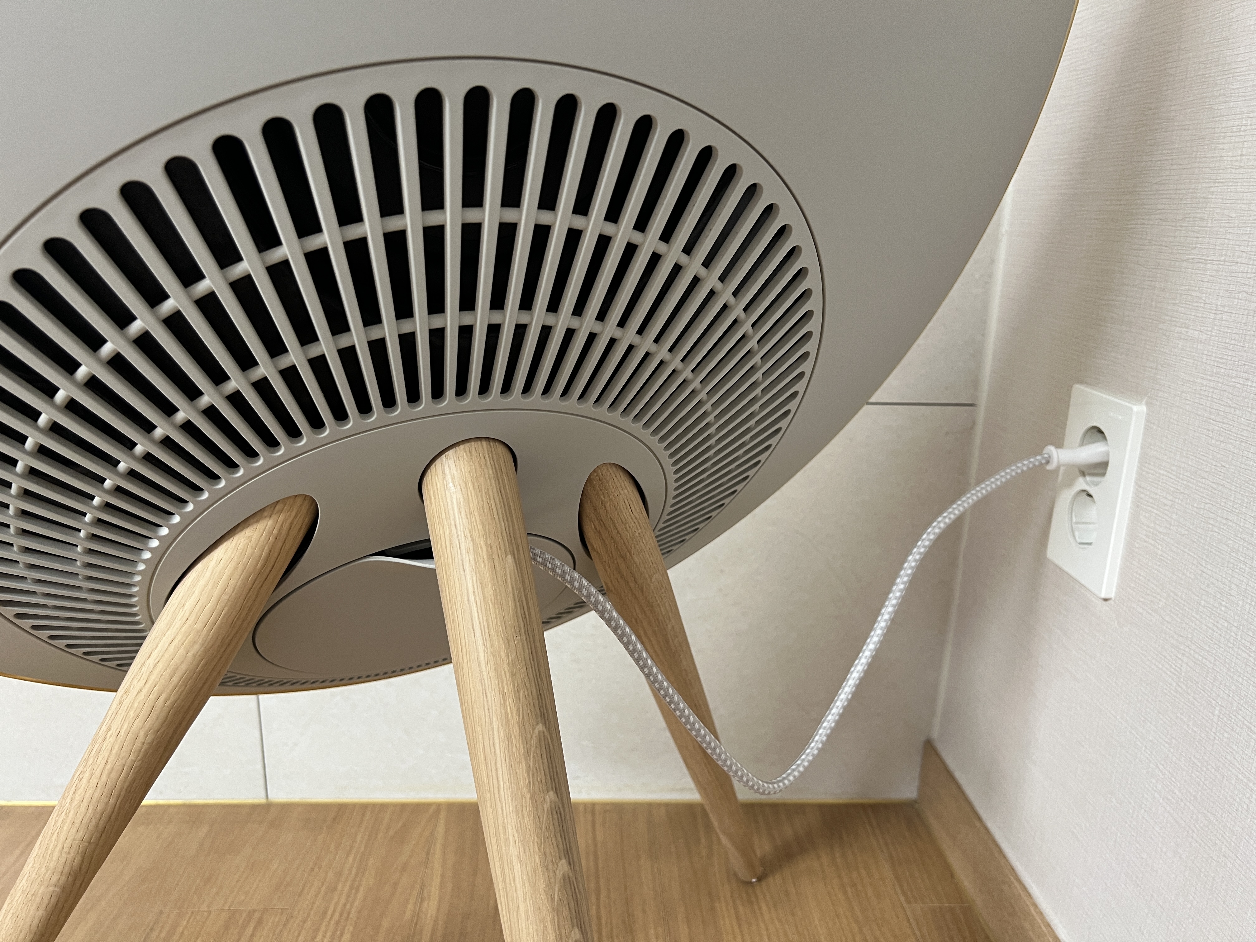 거치하려는 거실 모서리에 마침 콘센트가 있어 정면에서 봤을때 케이블이 보이지 않게 설치가 가능하다. 디자인이 단순한 형태이니 만큼 전기선이 안 보이게 처리하는게 중요.