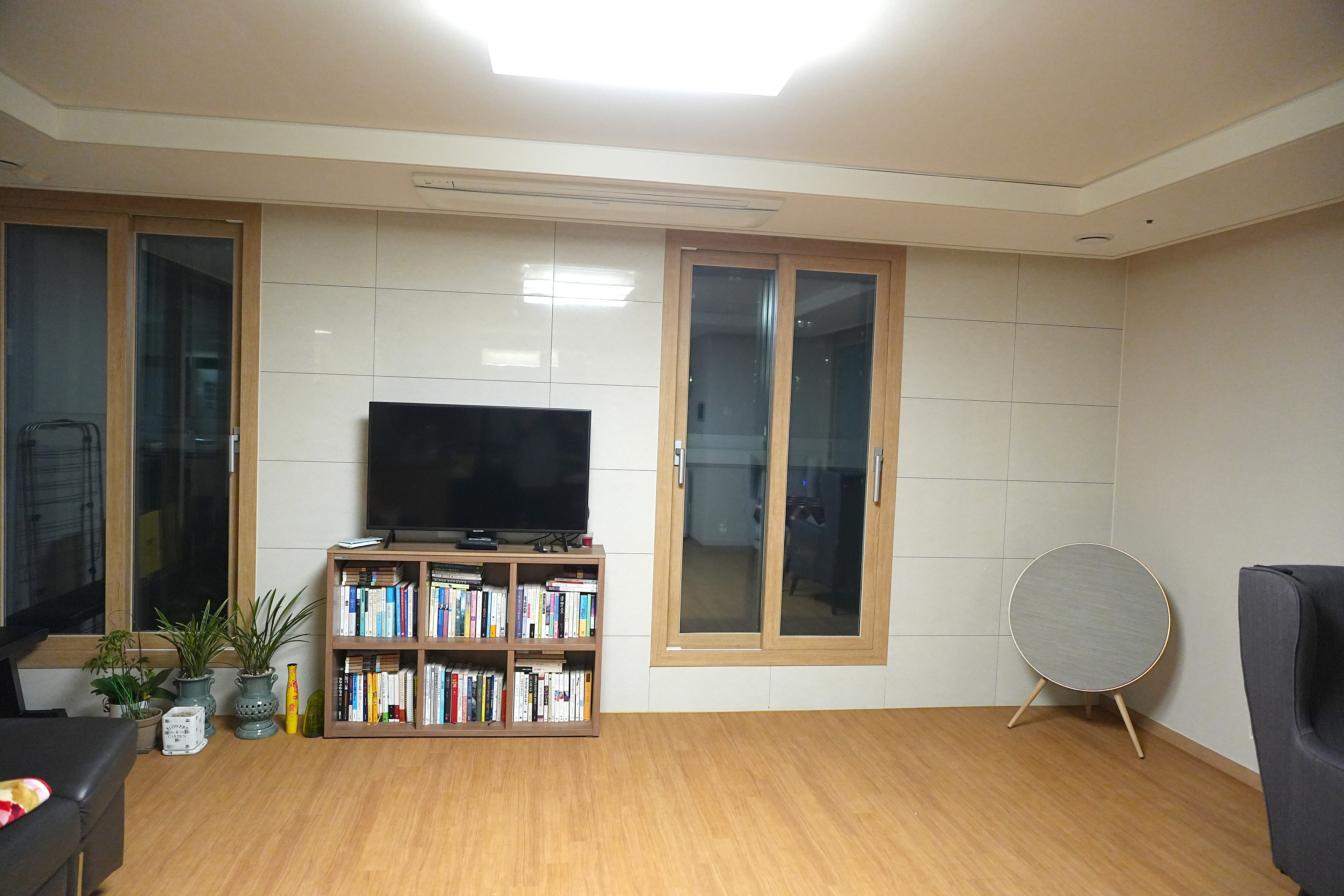 짜잔~!!. 거실 모퉁이에 거치 완료. 일반적인 한국식 아파트 거실에 장착하기에는 이 골드톤 색상이 무난한 것 같다. 그레이 보다는 좀 더 따뜻한 느낌.