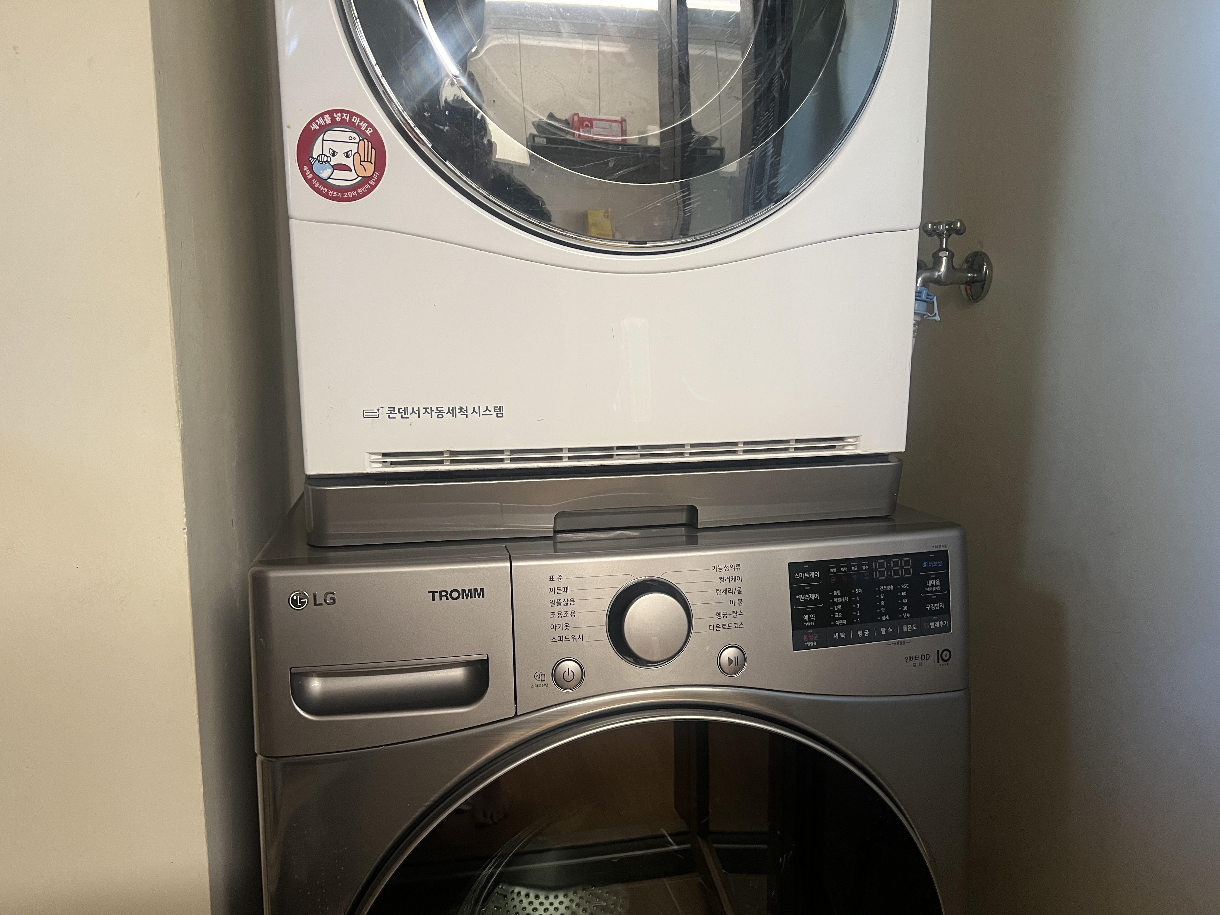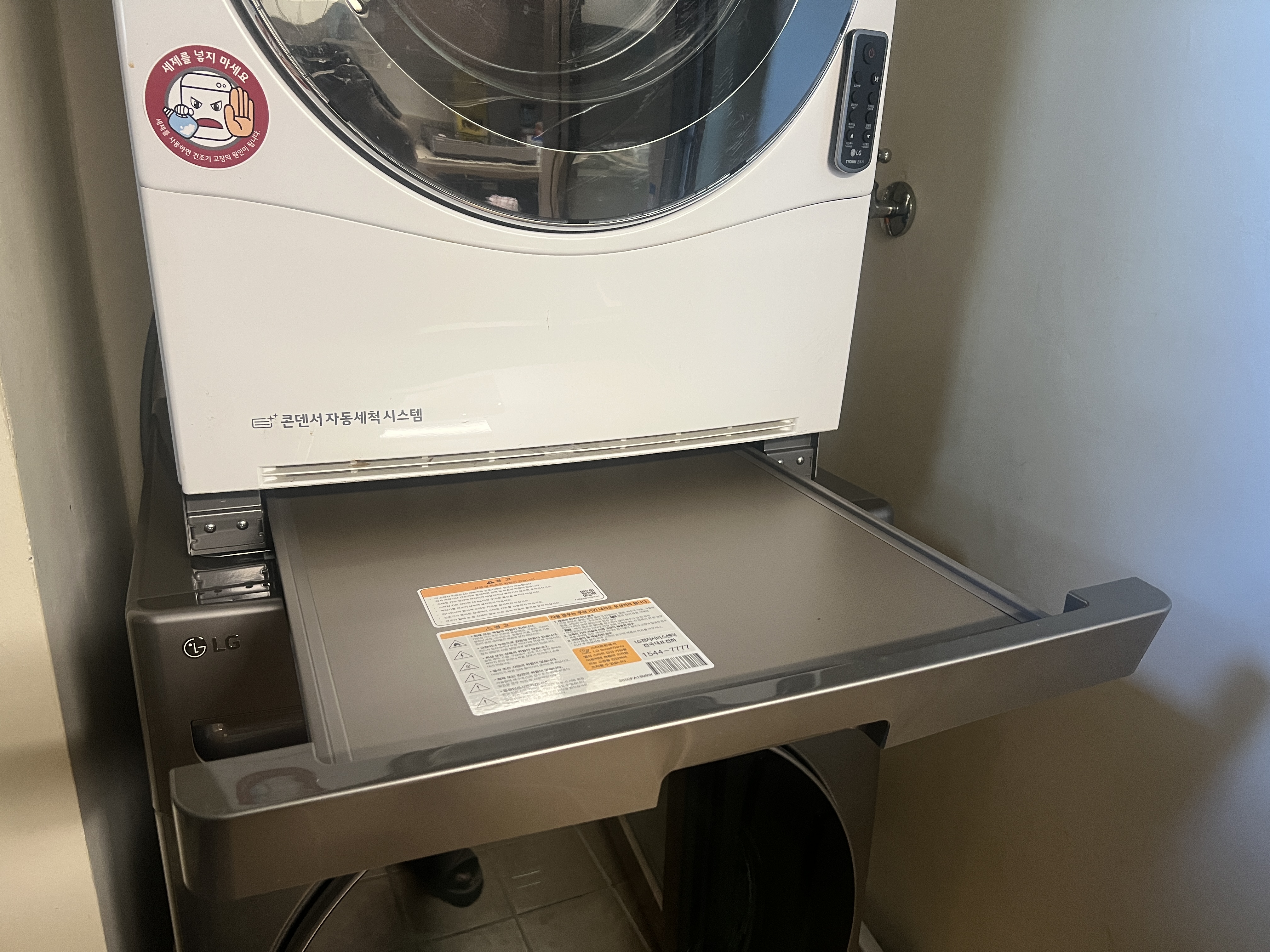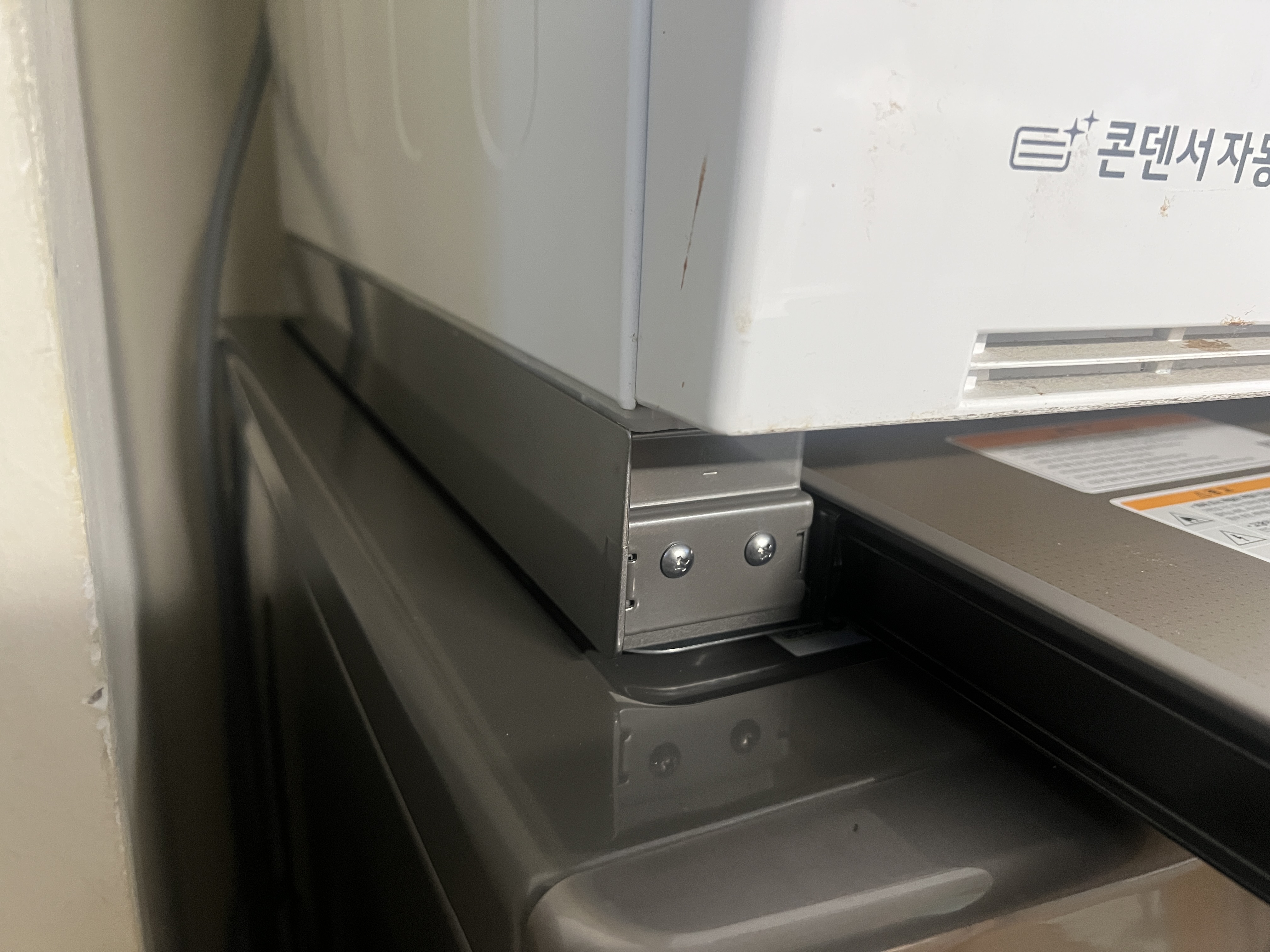 세탁기 구입하면서, 거실에서 항상 돌리던 건조기를 세탁기 위에 올릴 생각으로 서랍형 키트라는 걸 주문했다. 앵글로 수납장을 만들어야 하는줄 알았는데 LG 정품으로 2단 적재 가능하게 만드는 키트가 나와서 같이 주문.