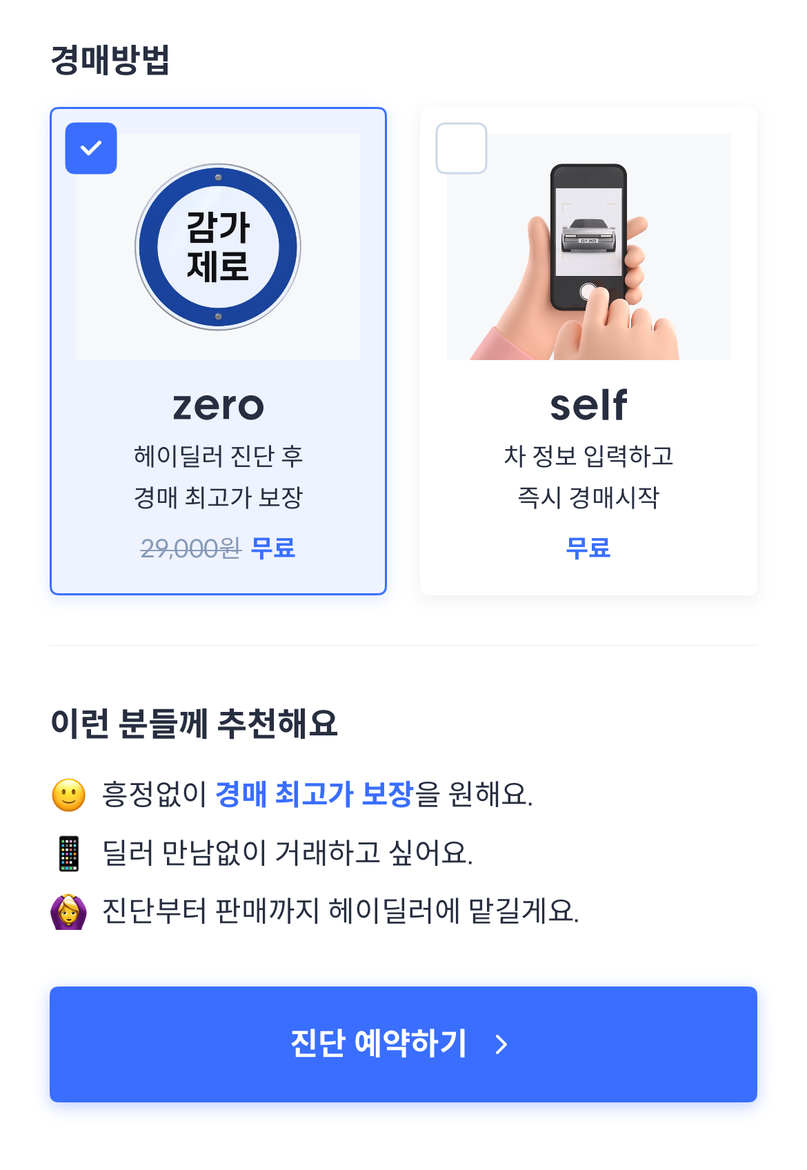 참고로 진행 화면에서 경매방법 선택 버튼에서 헤이딜러 제로 선택할수 없는 경우가 있는데, 판매 지역, 차종, 연식 등등에 따른, 우리가 알 수 없는 헤이딜러만의 기준에 의해서 제로 경매를 할 수 없는 케이스라고 한다. 우선 헤이딜러 제로 경매가 가능하다는 것에 안도하고 진행 키로 결정.