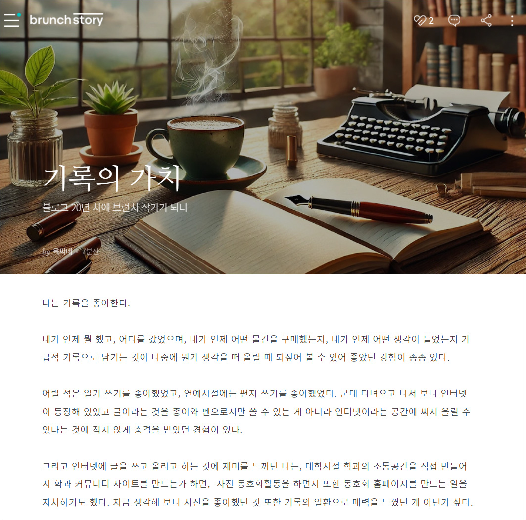 일상의 기록이 아닌 어떤 특정 주제에 대해서 생각을 좀 더 깊게 하고 정리를 하고 싶을 때 블로그에 글을 쓰곤 했지만, 이런 글들만 따로 모아놓으면 좋겠다는 생각에 브런치에 작가 신청을 하였고 2024년 12월에 선정이 되었습니다.
