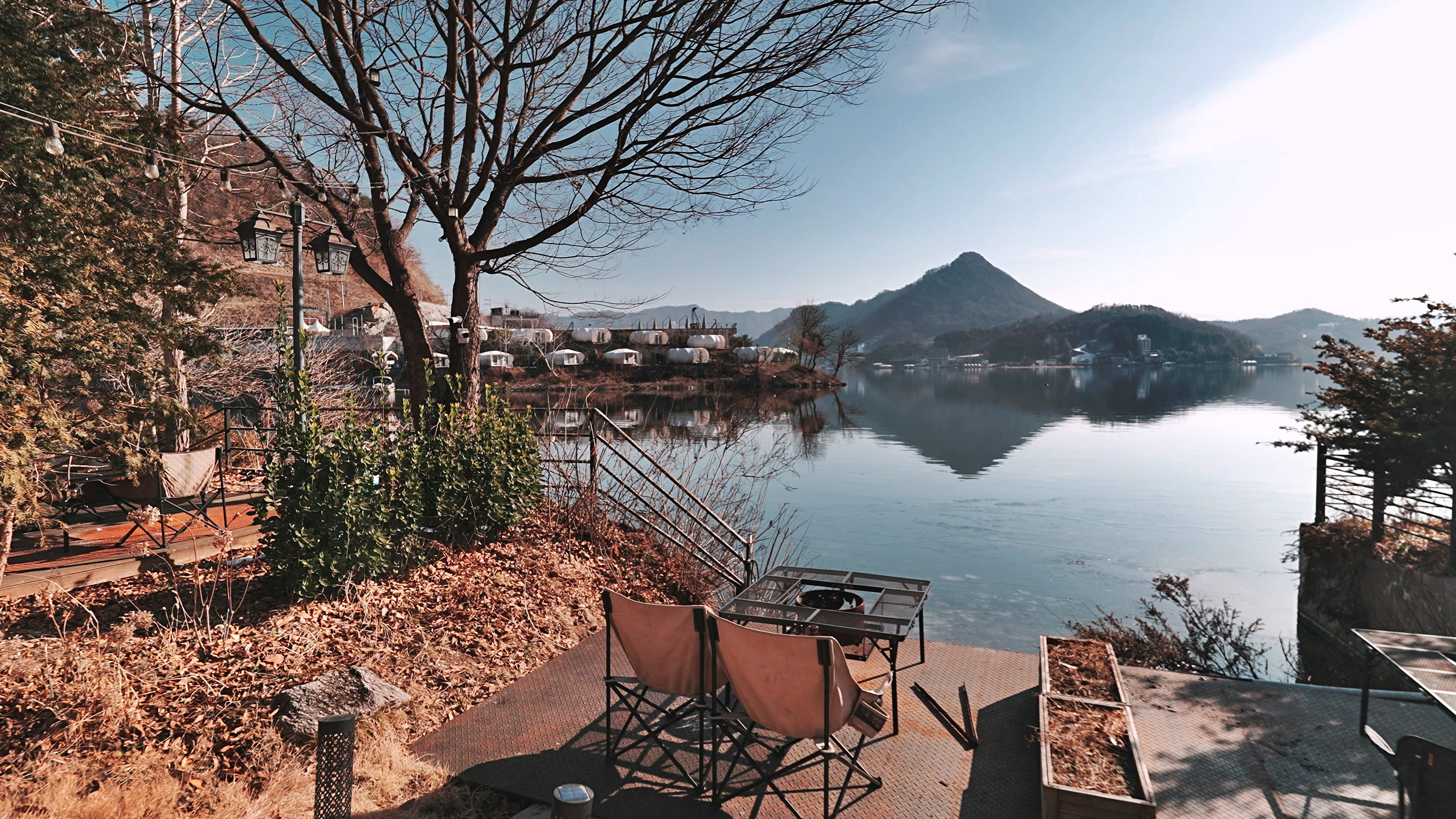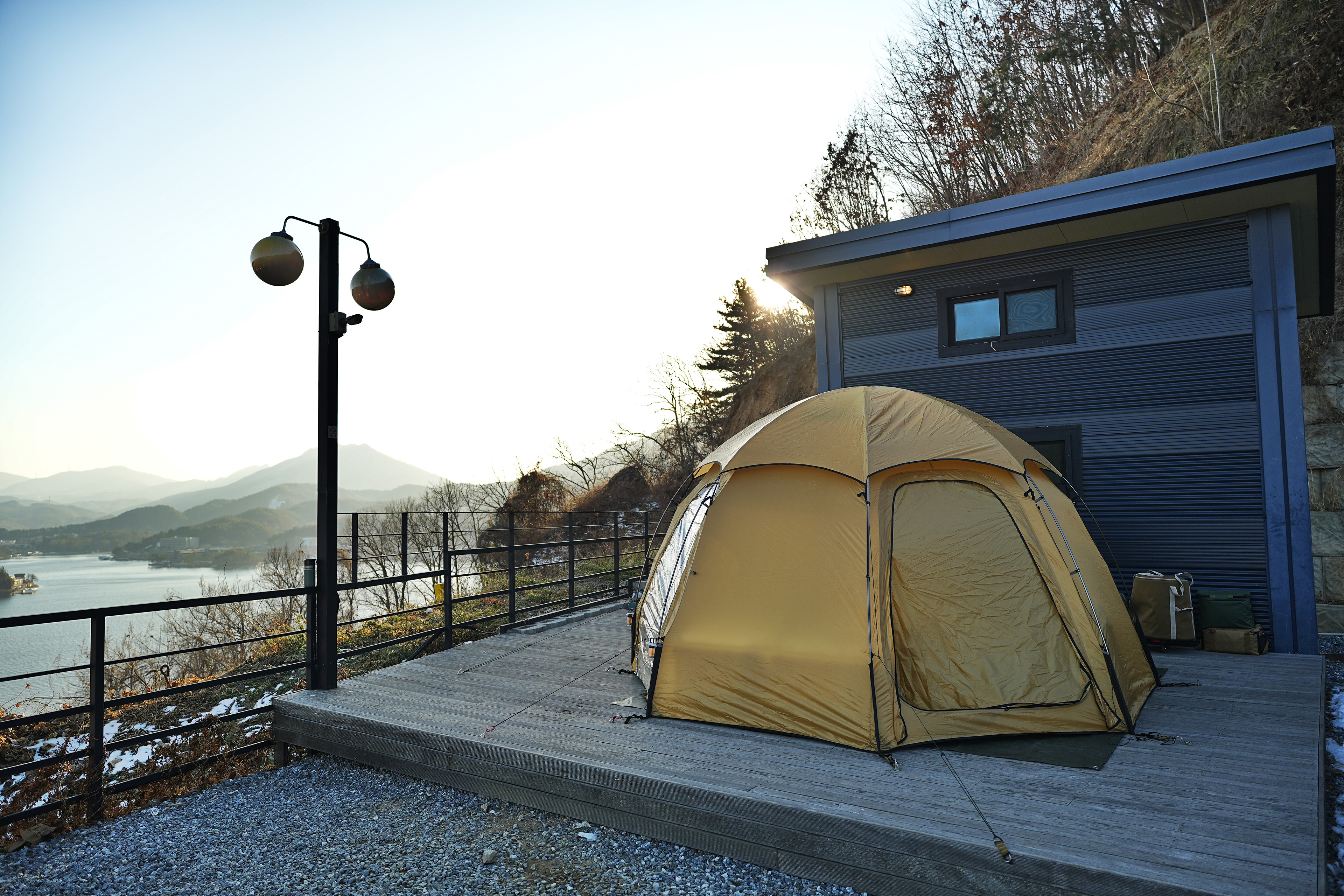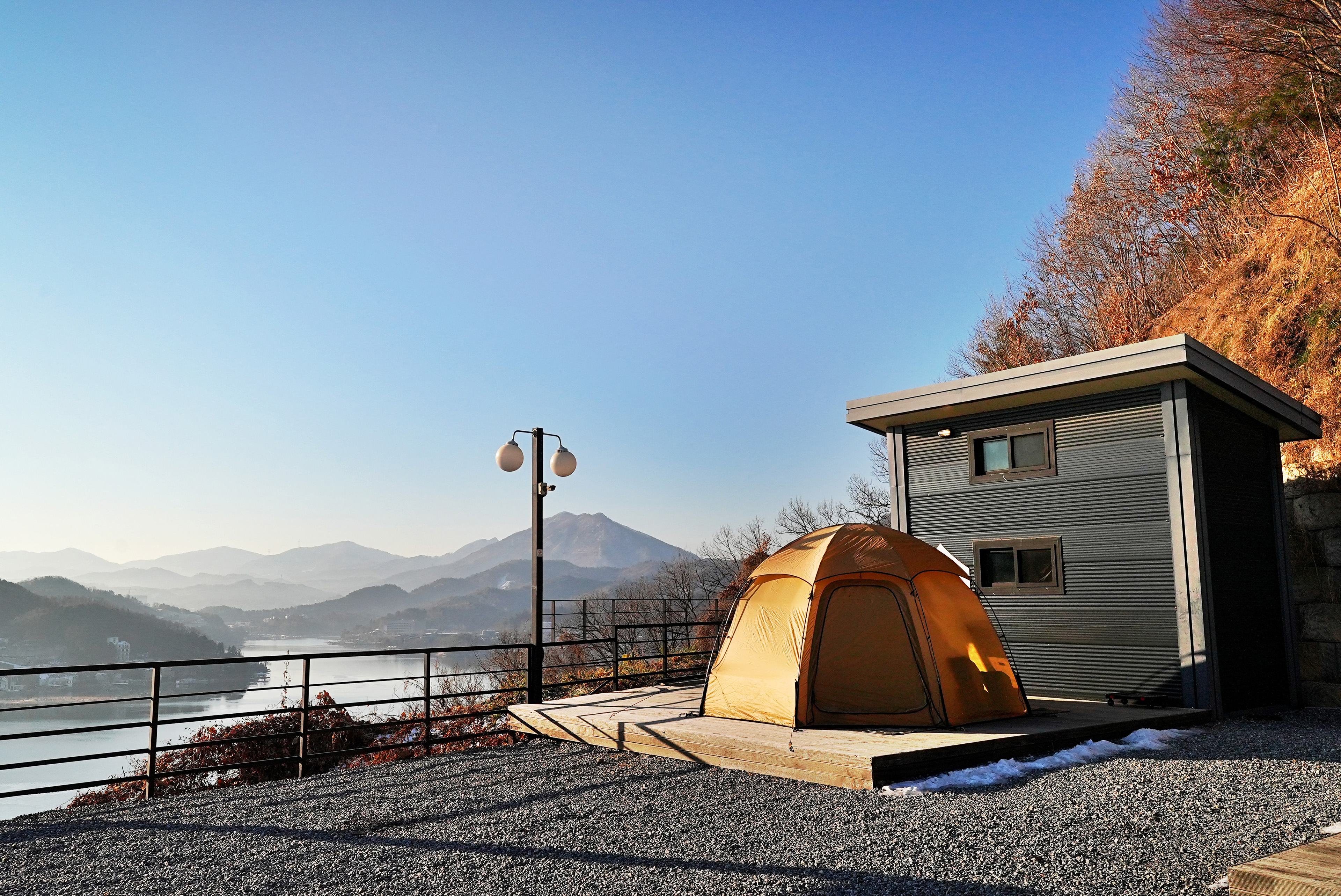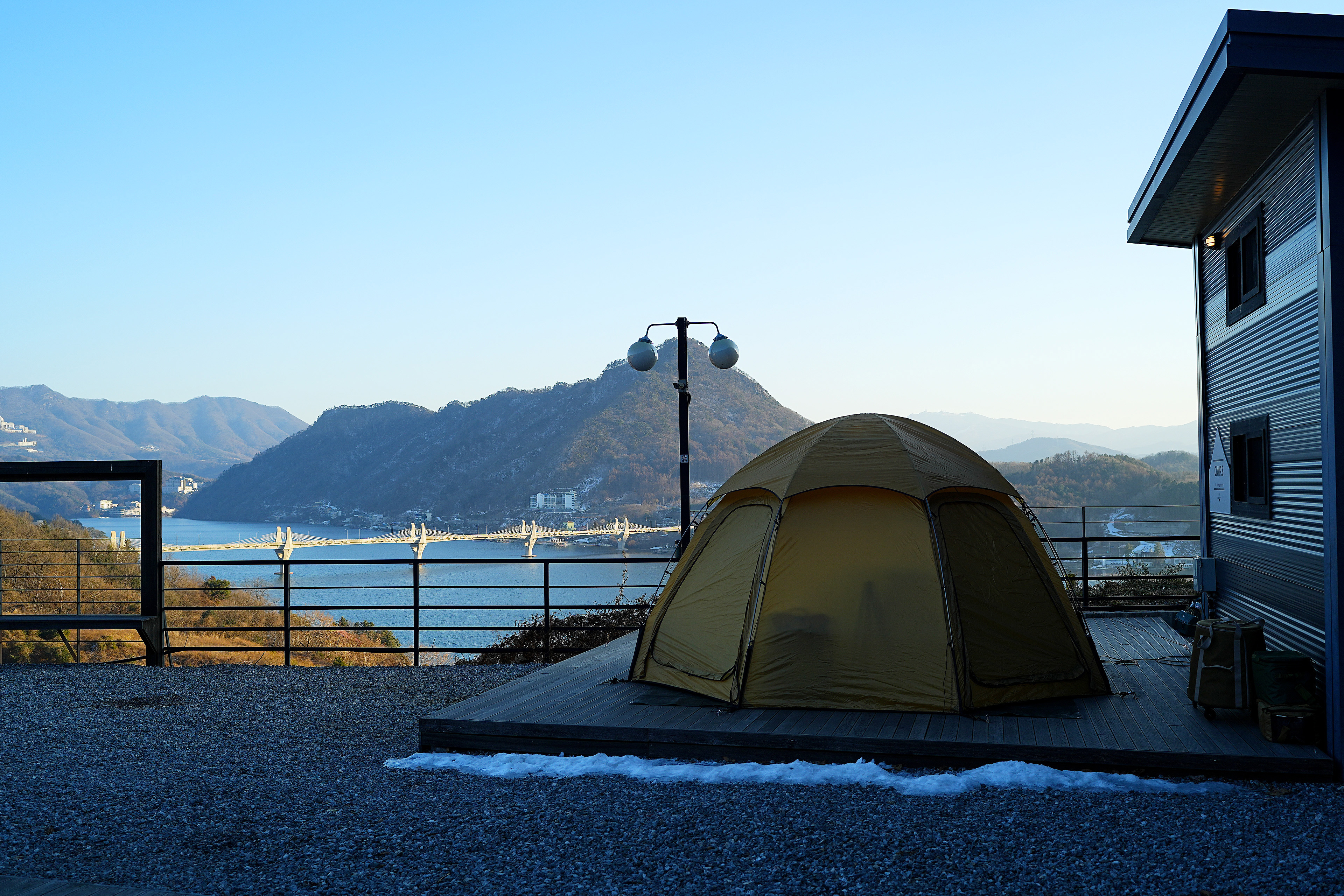설치하고 나서 텐트안에서 바라본 뷰. 청평호가 보이는 위치에 있어 뷰가 끝내준다.
