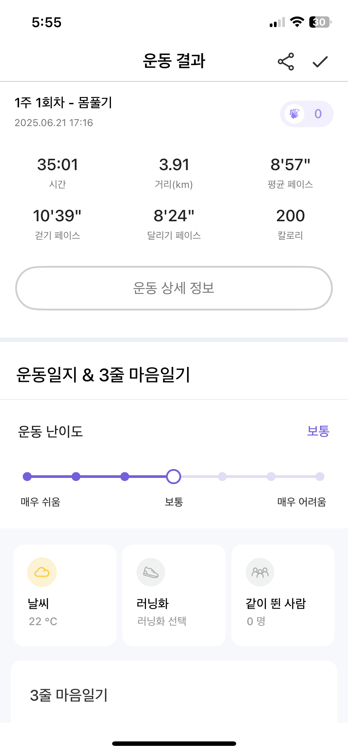 엄마 Blog Run Day 앱 활용 러닝 (2025.06.21) by 연주맘 (Jiny) 2025. 6. 22. 너무 빈속으로 달려서 중간에 힘들어 포기하고 싶었지만 첫날이라 꾹 참고 끝까지 완주. 잘 참았다. 5분 달리기, 1분 걷기의 반복. 보이스를 통해서 구간별로 코칭을 해줘서 코치와 함께 걷는 느낌이랄까? ㅎㅎ 공유하기 게시글 관리 육씨네 (6cne.com) 관련글 생일선물. 뉴발란스 530 (2025.07.01) 새 러닝화. 아디제로 보스턴 13 (2025.07.05) 만 50세 생일 에피소드 (2025.06.18) 올드몬트 베이글 (2025.03.01)