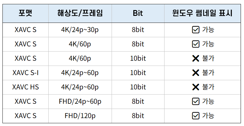 우선 이 부분을 이해하려면 영상 포맷에 대해서 이해해야 하는데, XAVC S 의 경우 H.264 포맷, XAVC HS 의 경우 H.265 포맷으로 H.265 포맷은 윈도우에서 썸네일을 지원하지 않는다. 그리고 10 bit 영상인 경우에도 윈도우에서 기본적으로 썸네일을 지원하지 않는다.