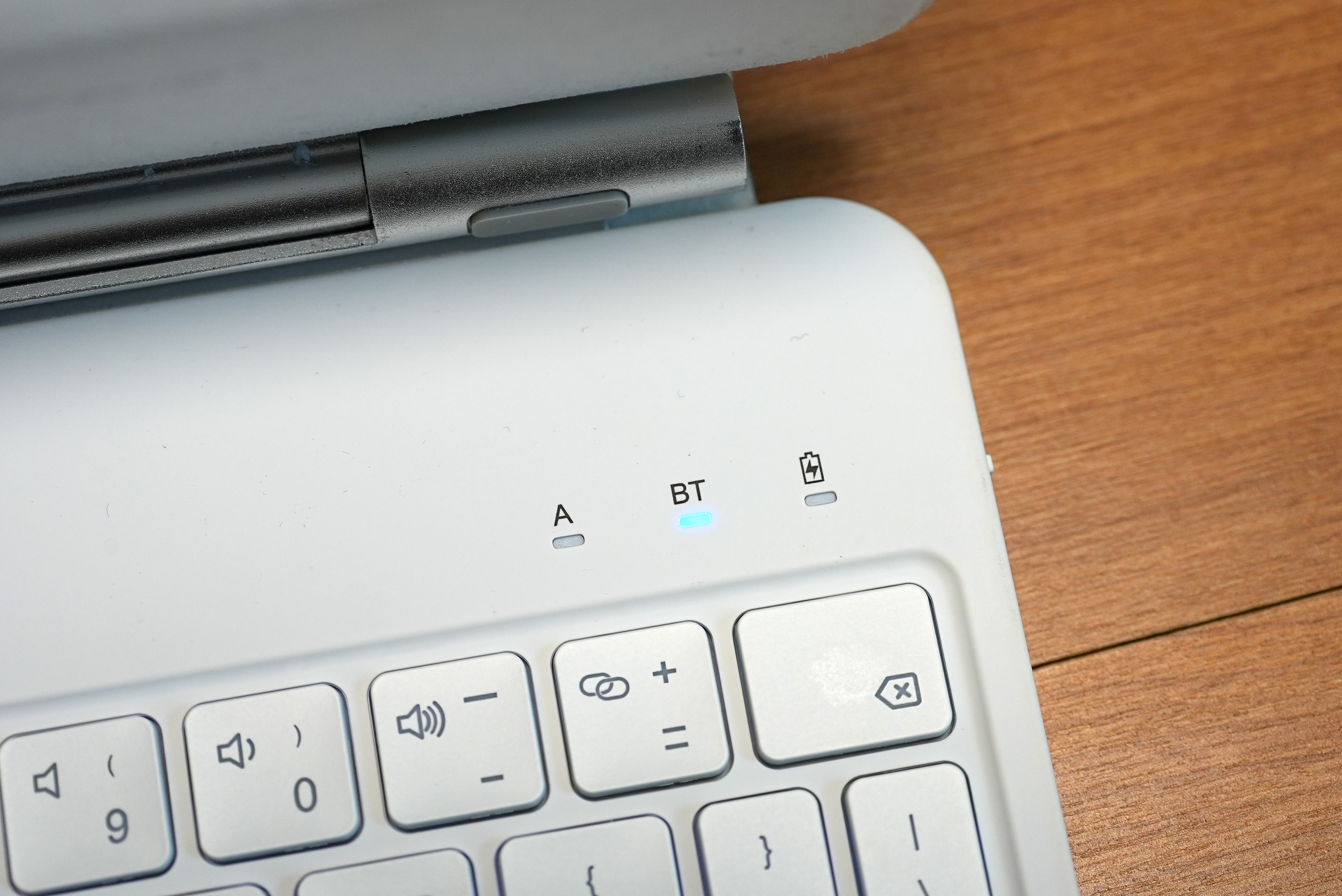 자세히 보면 우측에 자판버튼, 블루투스, 충전 표시기가 있다.