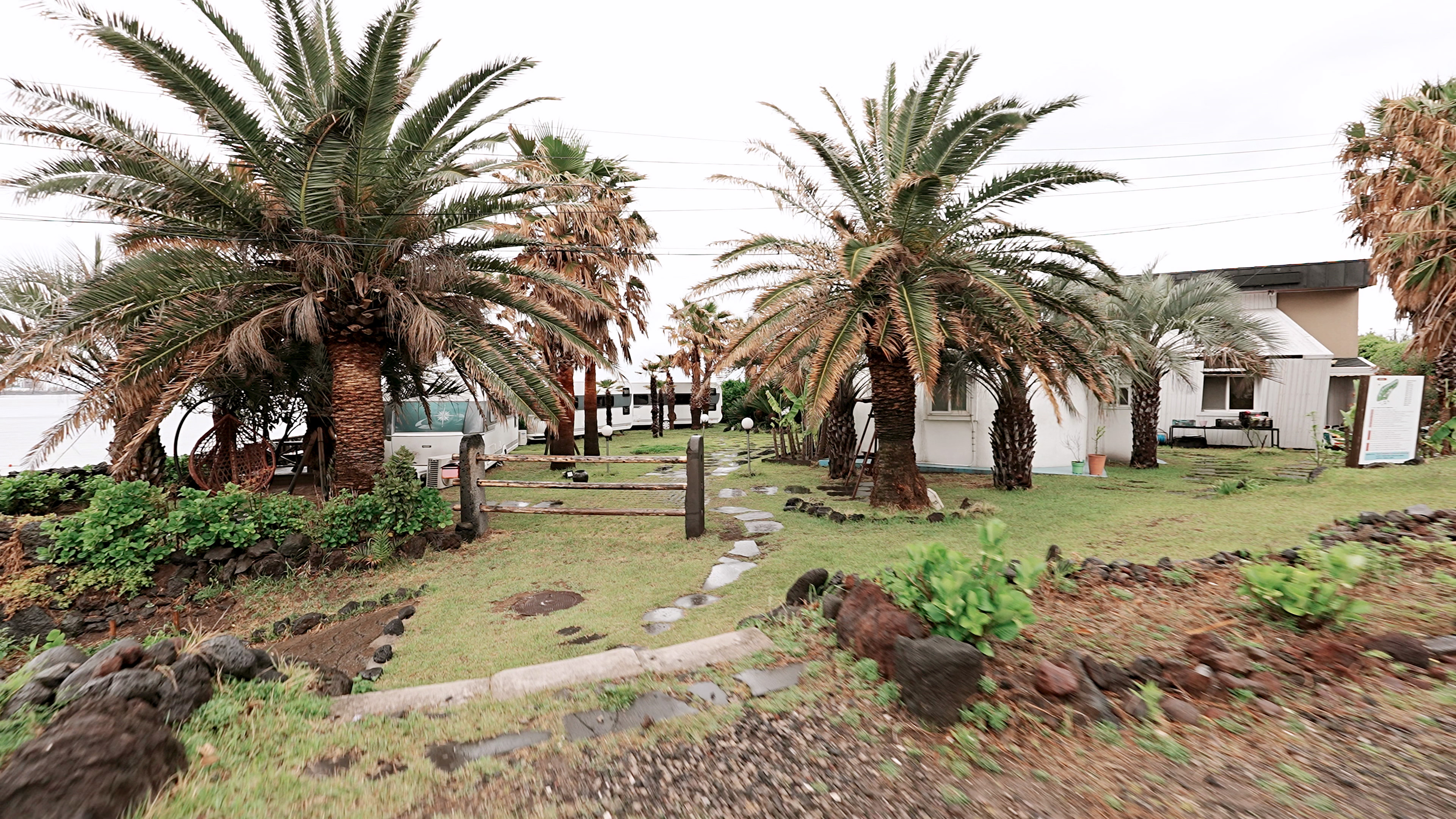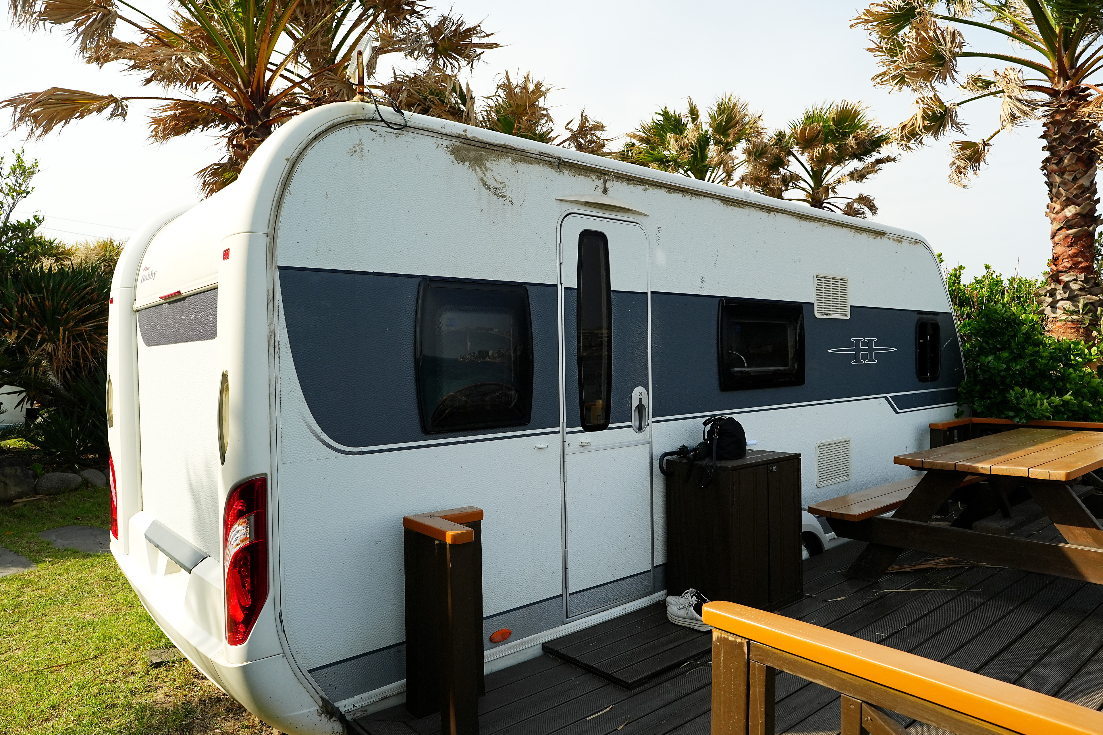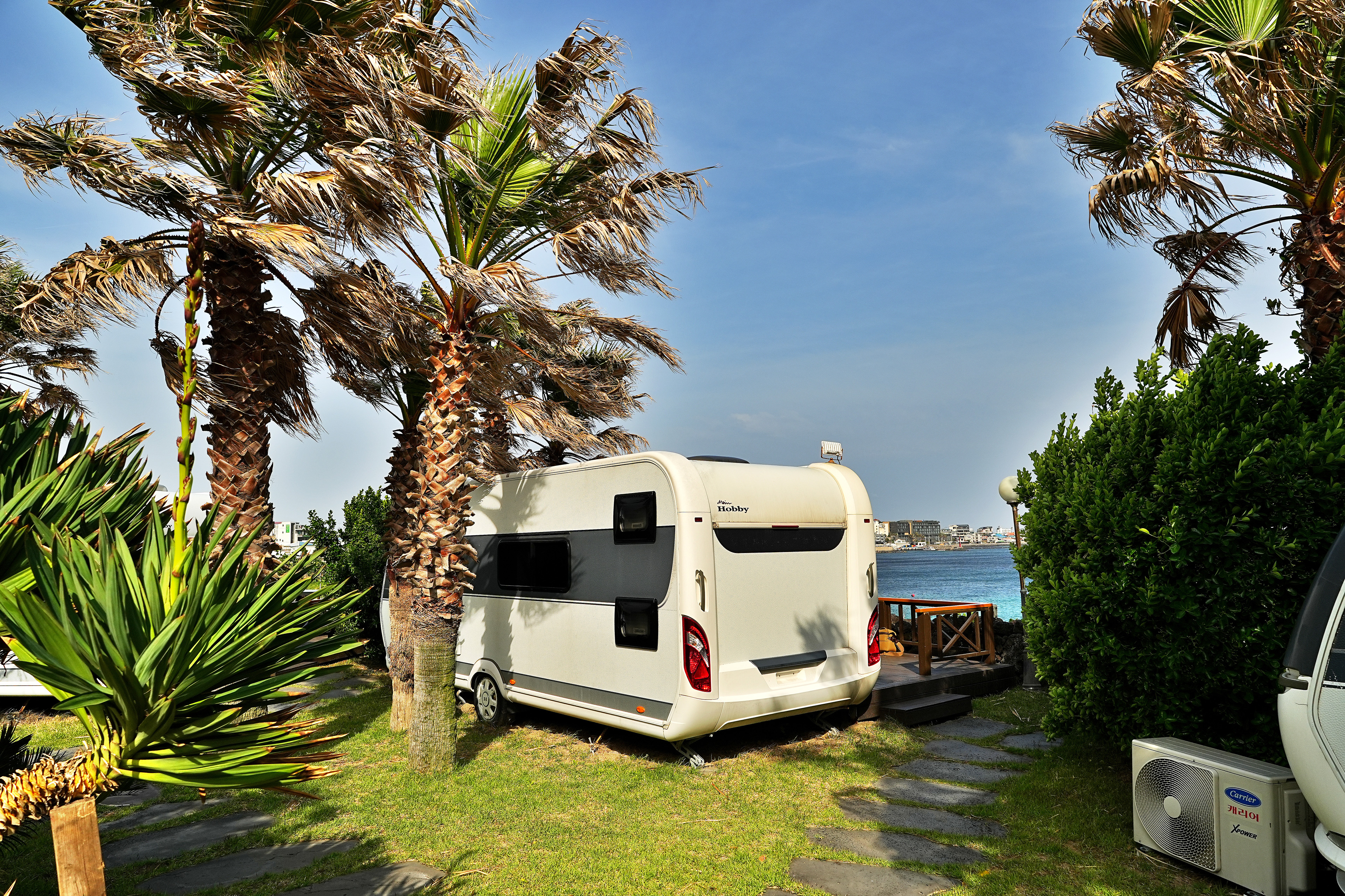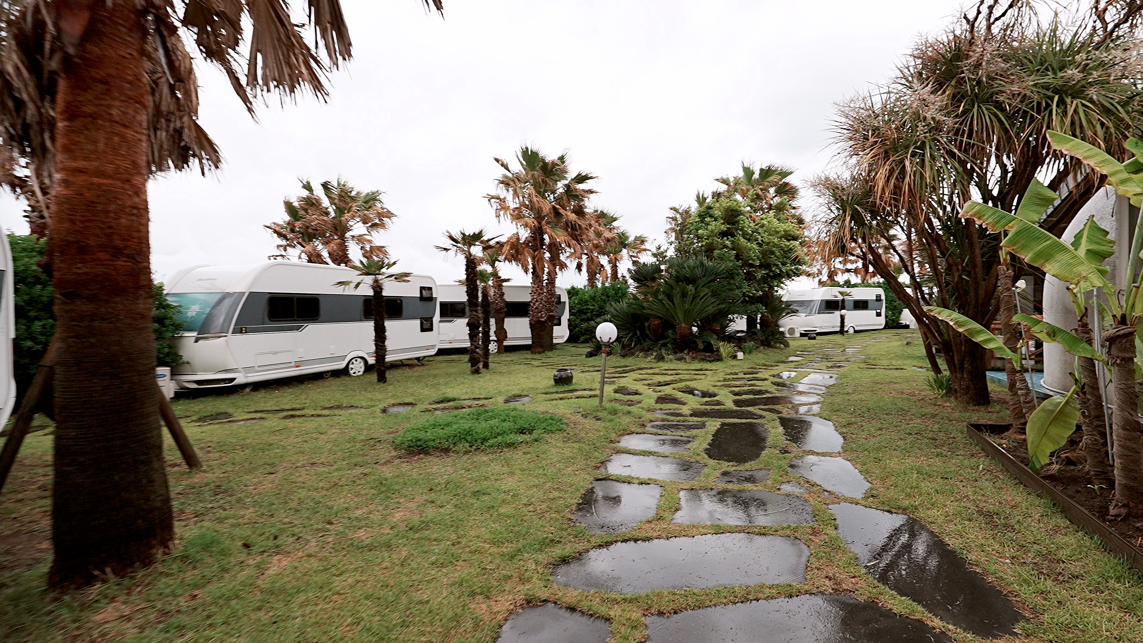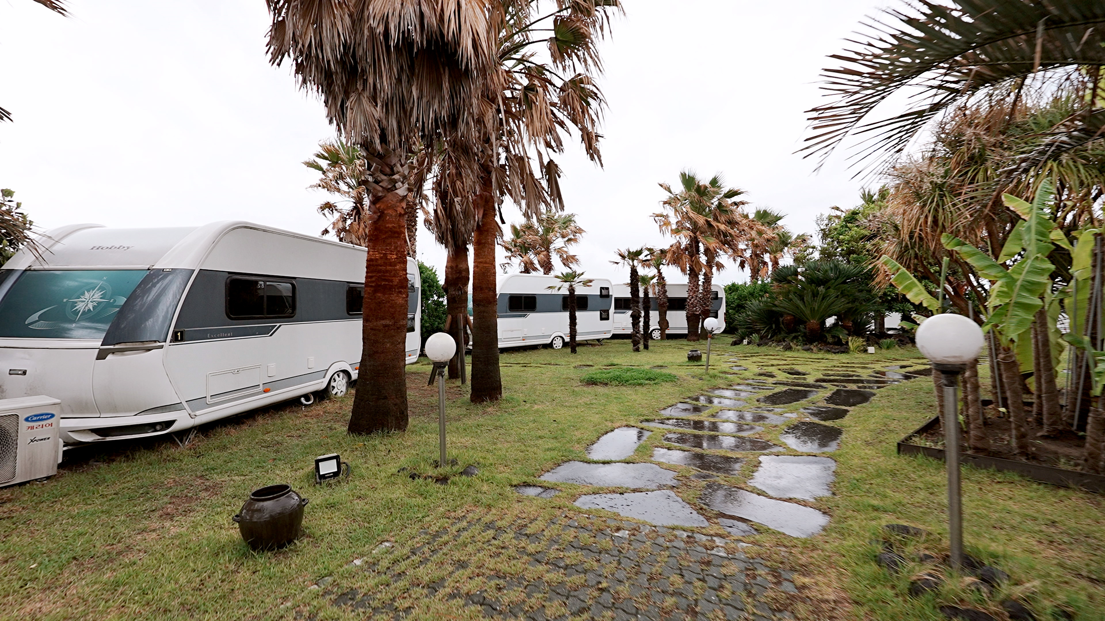 주차를 하고 캠핑장에 들어서면 야자수와 어우러진 카라반들이 해변을 따라 위치해 있다.