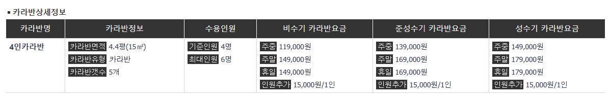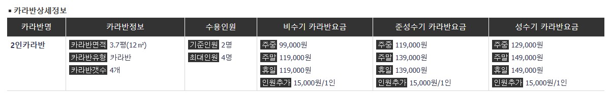 4인 카라반 총 5대로, 주말 비수기 기준 1박에 15만원