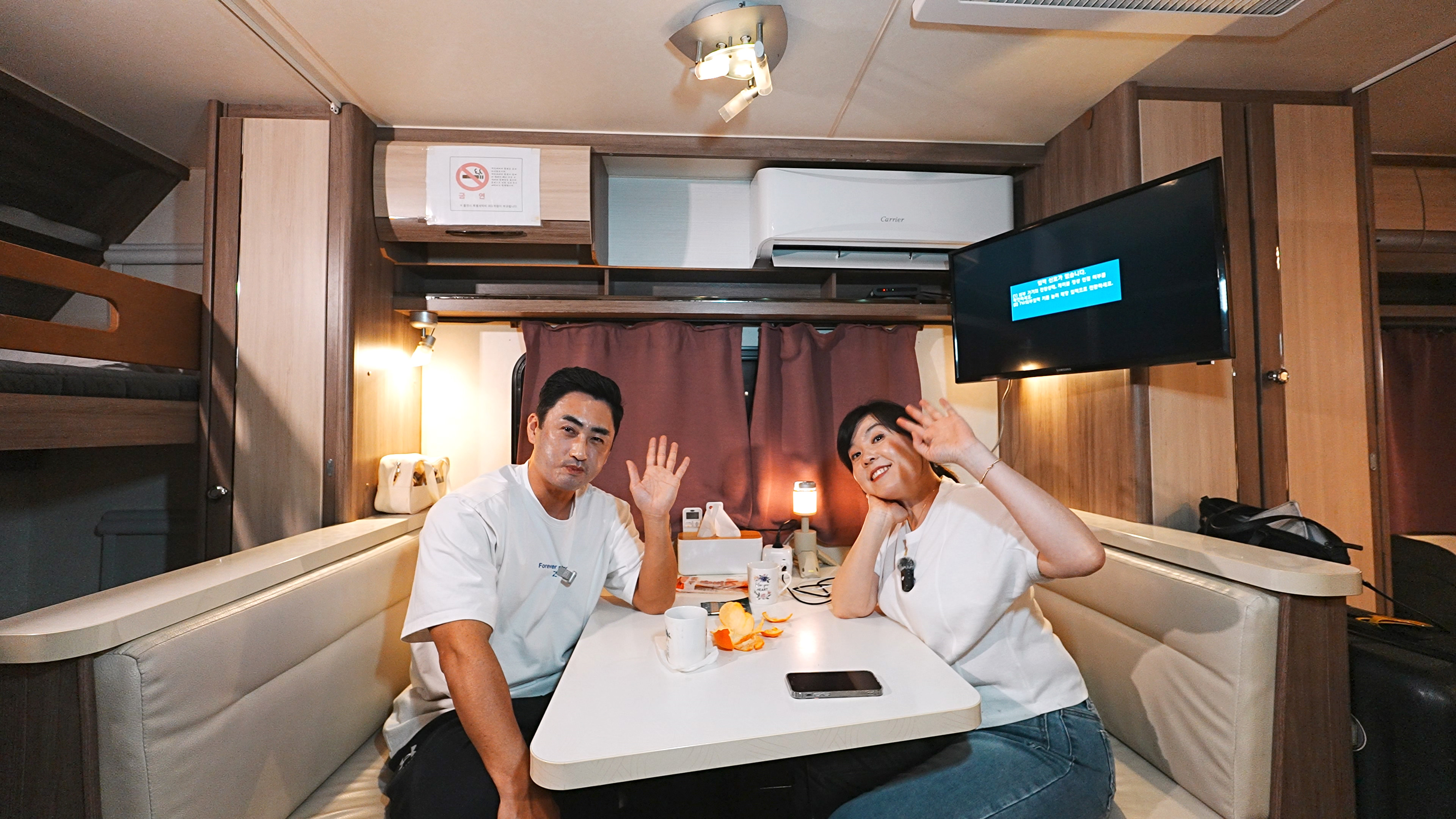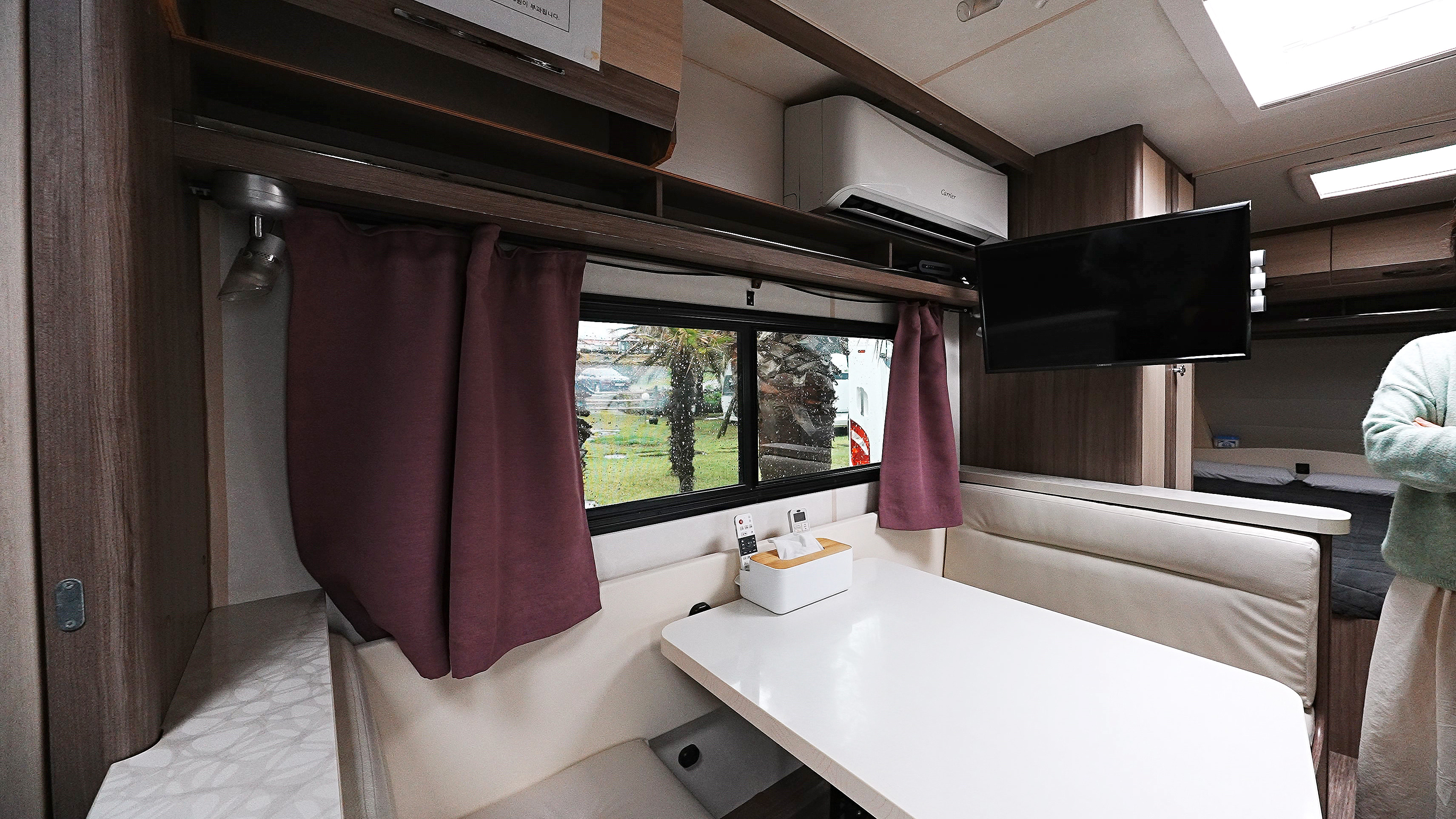 메인 식탁. 바로 위에 티비/ 에어컨이 위치해 있는데, 티비는 안쪽 침대에서 볼 수 있도록 돌릴 수 있게 되어 있다.