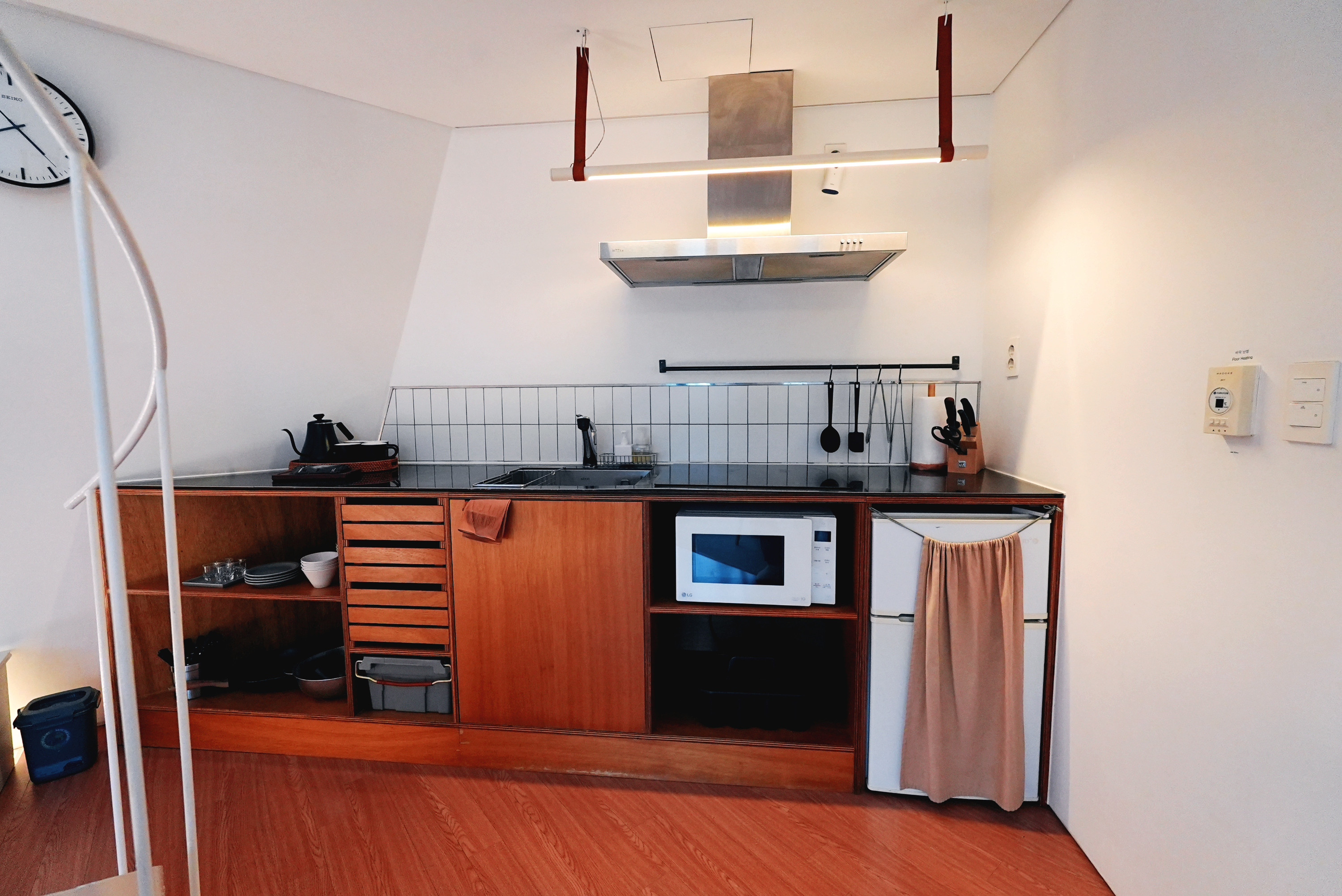1층의 취사시설. 냄새를 유발하는 음식은 실내에서 취사를 하지 않도록 안내하고 있었다.