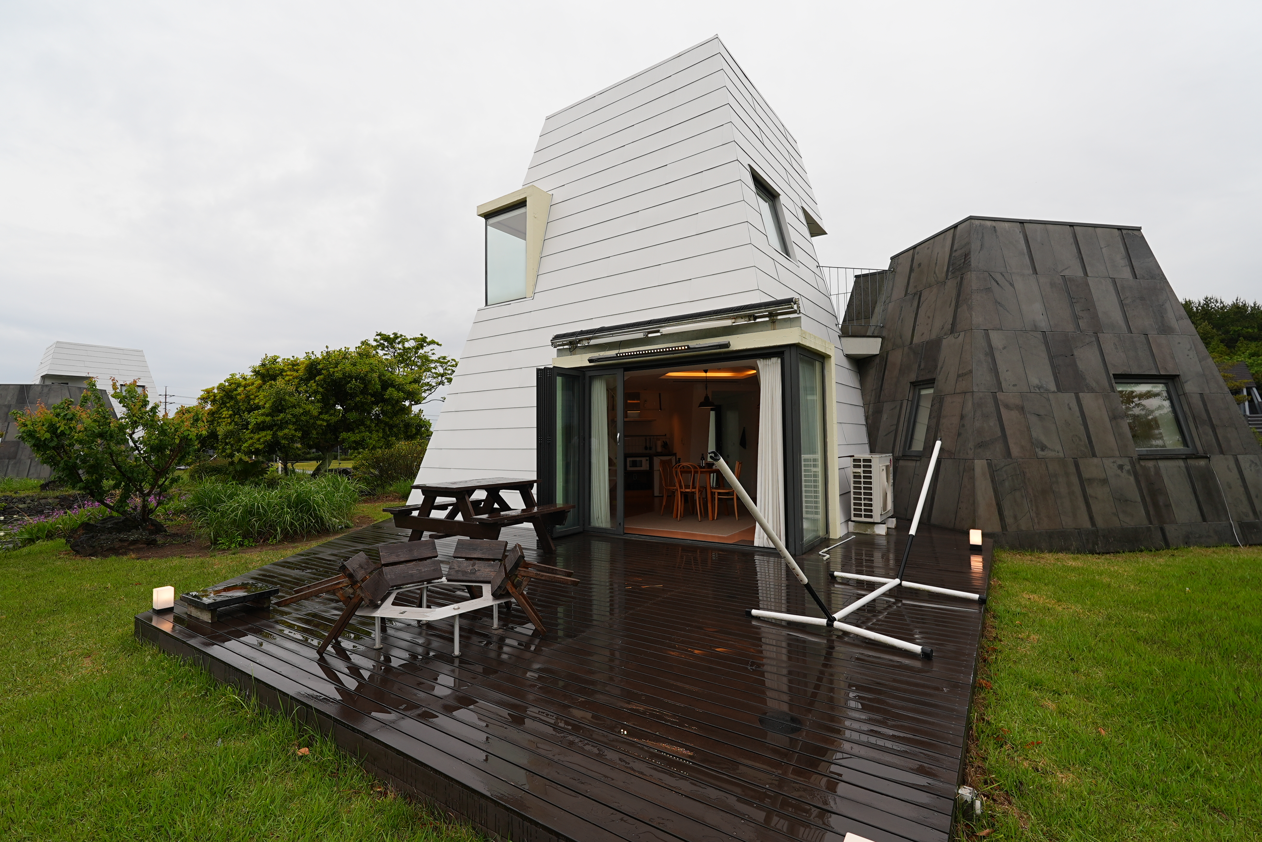 밖에서 본 LOGDE TWIN A 객실. 하얀 건물이 1/2층으로 구성된 메인공간이고, 시커먼 작은 건물이 1층 화장실이다.
