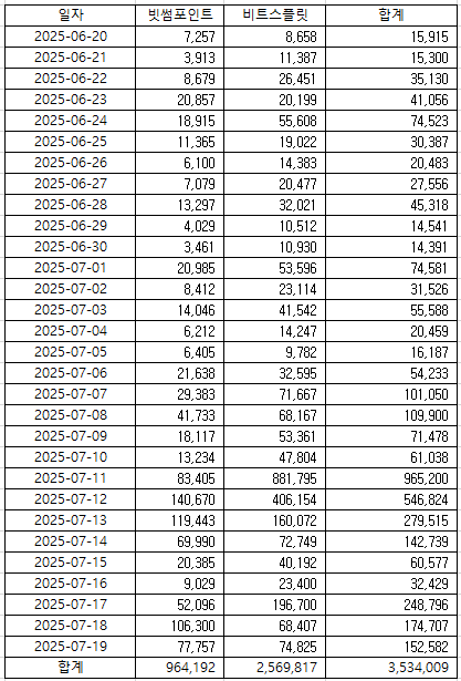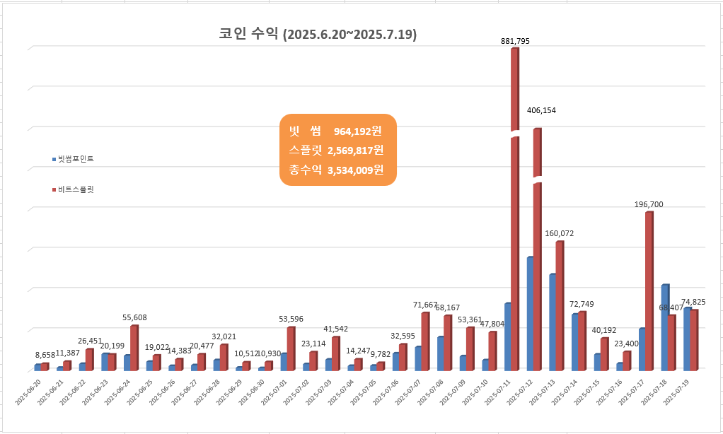 연 15만원짜리 프로그램(비트스플릿)을 구매해서 최근 1개월(6.20~7.19) 코인으로 350만원정도의 수익을 냈다. 최근 코인의 강한 상승으로 인해 비트스플릿 운영 이후 최고의 실적을 가져온 것이긴 했지만, 비트스플릿을 3월 3일부터 운영했는데, 빗썸포인트를 제외하더라도 월평균 최소 150만원의 수익은 안정적으로 가져다 주는 것 같다. 비트스플릿 무조건 keep going!!!