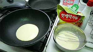 비가 추적추적 내리는 주말.. 연주는 장모님께서 봐주고 계서서, 오늘은 연준이랑 나랑 둘이서 토요일을 보내게 되었다. 점심을 뭘 먹일까 하다가, 지난주에 사놓았던 핫케익을 손수 만들어 보기로 했다. 지난주에 장보다가 집에 있는 오븐을 한번 써볼까 해서 골랐는데, 알고보니, 이런건 오븐에 굽는게 아니고, 후라이팬을 써서 하는거라고 설명서에 나와있었다. 계란하나 풀고, 우유 넣고, 그리고 케익가루 넣고 후라이팬에 데폈더니, 노릇노릇,, 여기에 연준이 먹기좋게 딸기시럽 살짝 뿌리니 그럴듯하게 완성이 되고, 연준이가 너무 좋아했다. 일단 시럽의 빨간색이 연준이 맘에 들었고, 케익의 맛보다 달달한 시럽때문에 잘 먹는듯 하다. 점심은 이걸로 해결했는데, 저녁이 벌써 걱정된다. 연준아.. 어설프게 만든거 잘 먹어줘서..