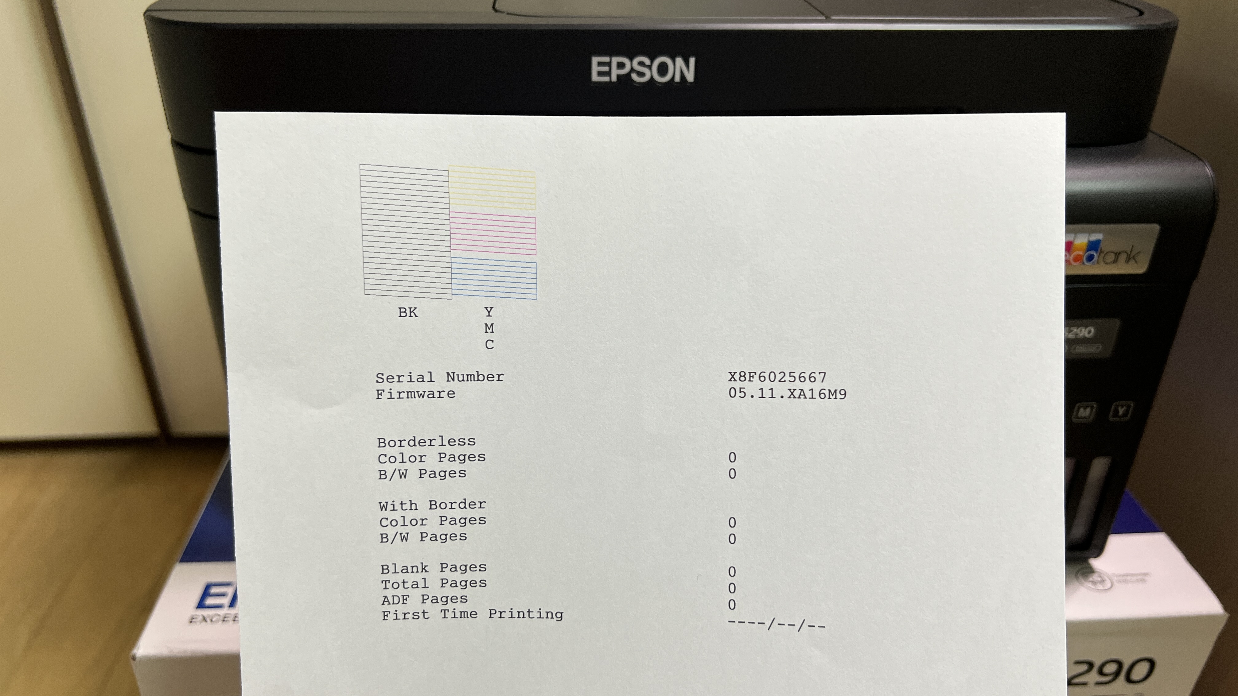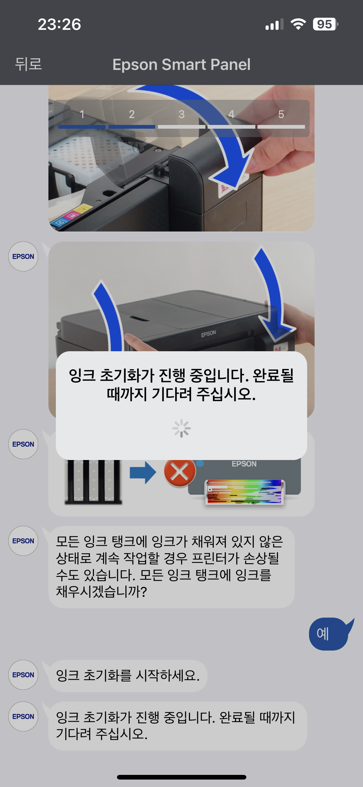 잉크 넣고 한참 걸려 초기화 완료 후 테스트 인쇄