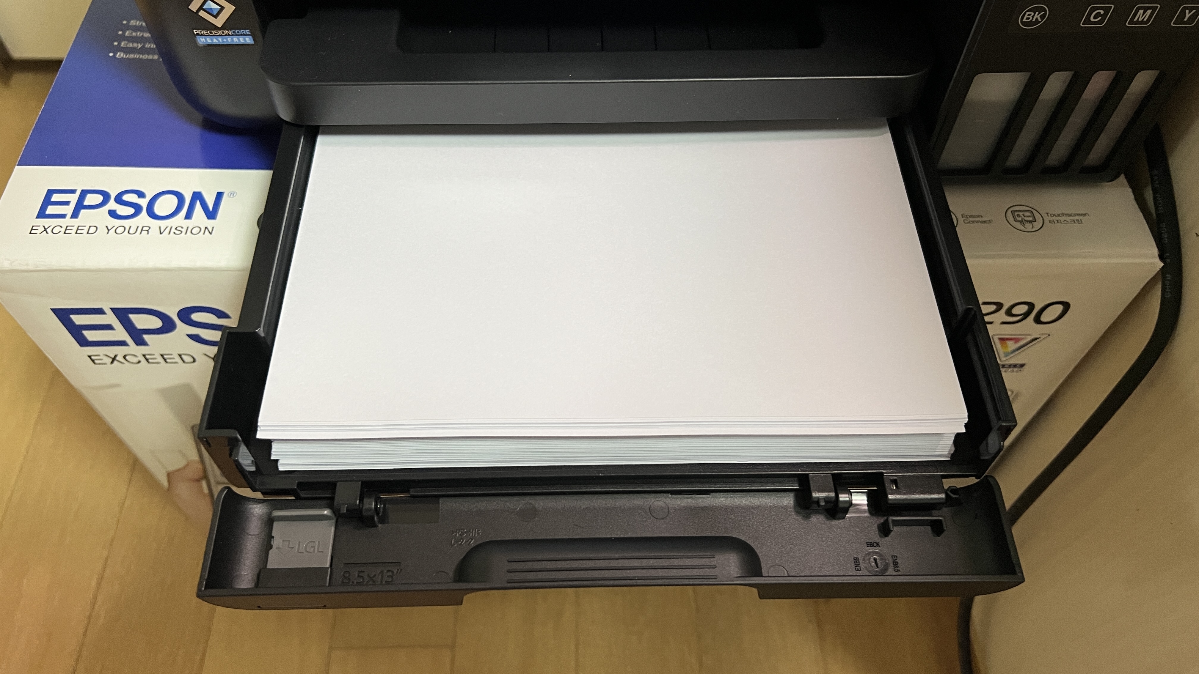기존에 사용하던 모델에 비해 좋은 점 중의 하나, 사무실용 큰 프린터같이 급지를 트레이를 통해 넣고 수납할 수 있어 종이에 먼지가 뭍은 상태로 프린터기에 들어가는 일이 없을 것 같다.